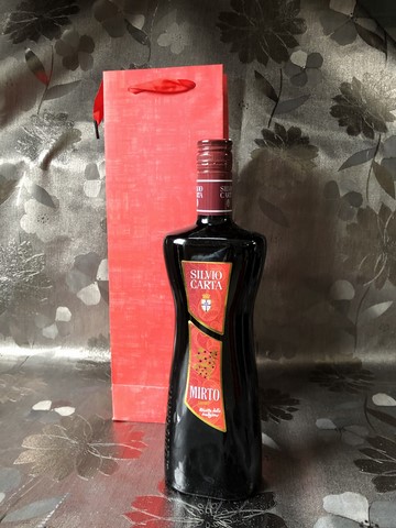 Elegante confezione con una bottiglia di mirto rosso Silvio Carta.